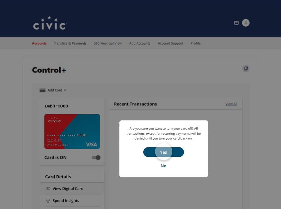 When you’re ready for your card to be active again, slide the toggle button back over. Confirm by clicking Yes.