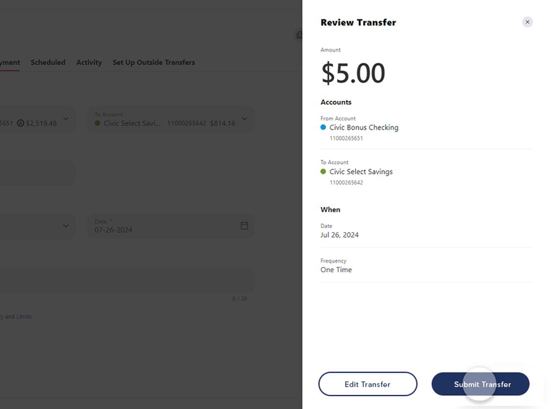 Choose the account to which the money will be deposited. All accounts eligible for moving money to will be listed. You will see any deposit accounts, Civic credit cards, loans, or any external accounts you may have set up.